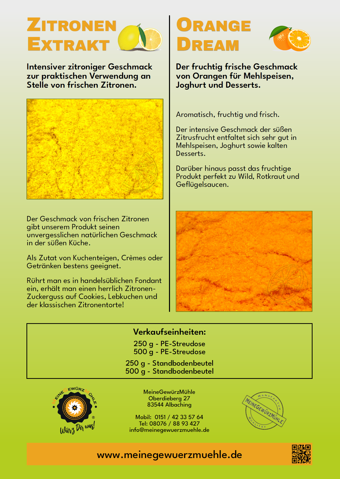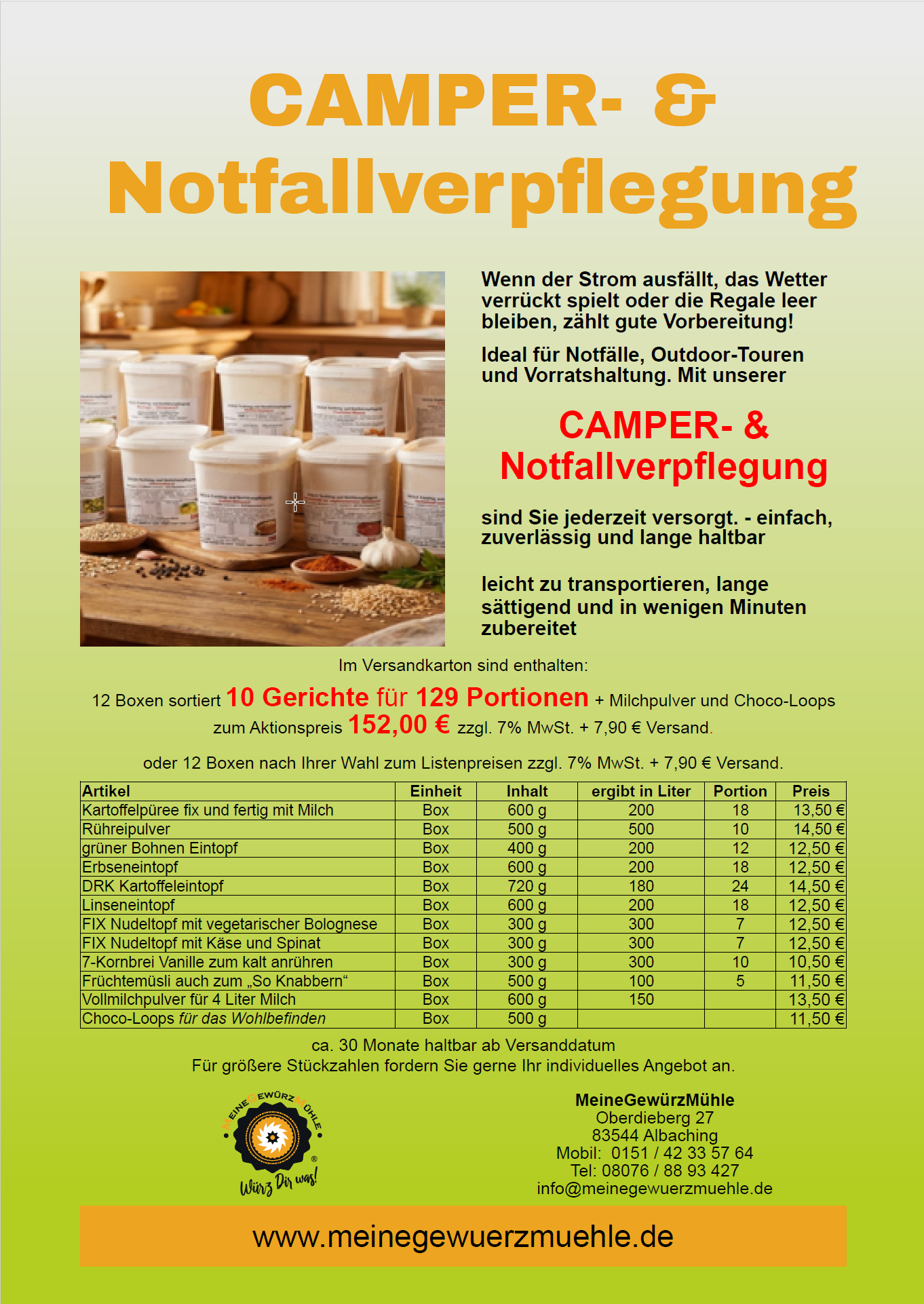 Unser Sortiment Privat Label Broschüre Unsere aktuelle Werbebroschüre mit allen unseren Privat Label Produkten als Download. Download CAMPER- & Notfallversorgung einfach, zuverlässig und lange haltbar Download Pyramiden-Salz Meersalz-Flocken zum Verfeinern und Dekorieren Download Zitronen- und Orangenextrakt intensiver fruchtiger Geschmack Download Gewürzmühlen Liste (PDF) aller Gewürze für Gewürzmühlen Download Essig & Öle Liste (PDF) abfüllbarenEssig & Öle Download Feine Gewürzmischungen Liste (PDF) allerGewürzmischungen Download